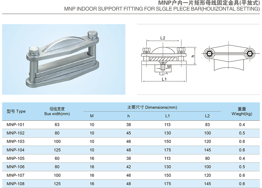 產(chǎn)品名稱(chēng):MNP戶(hù)內(nèi)一片矩形母線固定金具(平放式)